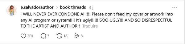 "JE NE TOLERERAI JAMAIS L'IA !!! S'il vous plaît ne nourrissez aucun programme ou système d'IA avec mes couvertures de livres ou mes illustrations!!! C'est moche!!!!!! SOO UGLY!!! ET C'EST SI IRRESPECTUEUX POUR L'ARTISTE ET L'AUTEUR!!!"